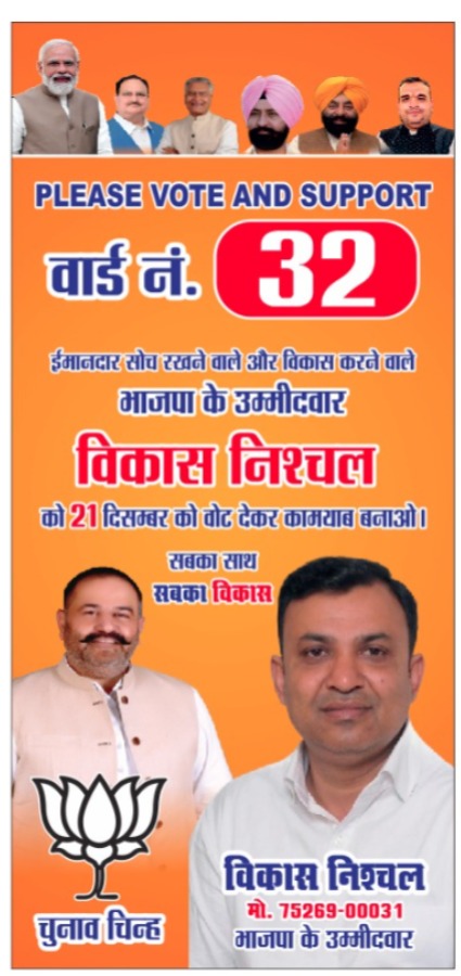 विकास निश्चल ने भरा नामांकन,वार्ड नंबर 32 से विकास निश्चल को मिल रहा है भारी समर्थन (जालंधर कुमार, कुलदीप) नगर निगम वार्ड नंबर 32 से भाजपा की उम्मीदवार विकास निश्चल को पूरे वार्ड में से भारी समर्थन मिल रहा है,डोर टू डोर सर्वे के दौरान सभी घर से उम्मीदवार विकास निश्चल को लोग जीत का आशीर्वाद दे रहे हैं। 32 नंबर वार्ड के निवासियों ने इस बार ने नए उम्मीदवार के रूप में भारतीय जनता पार्टी की उम्मीदवार विकास निश्चल को जीतने का मन बना लिया प्रतीत हो रहा है। पढ़े लिखे सुझवान विकास निश्चल हर प्रकार से वार्ड की सेवा करने में समर्थ दिखाई दे रहे है जो की जीत के पश्चात पूरे वार्ड का विकास पहल के आधार पर करवाएंगे। भाजपा के सीनियर नेता डॉ एस पी डालिया ने कहा कि जालंधर नगर निगम चुनाव में भारतीय जनता पार्टी का ही परचम लहराएगा। वार्ड नंबर 32 के अधीन आते क्षेत्र हर तरफ एक ही आवाज गूंज रही है कि इस बार सभी वोट बीजेपी को ही डाले जाएंगे और 32 नंबर वार्ड से उम्मीदवार विकास निश्चल को भारी मतों से जीत दिलवाएंगे।