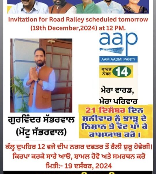 वार्ड नंबर 14 में आप उम्मीदवार मोंटू सभरवाल के हक में रोड शो कल दोपहर 12:00 बजे चुनाव कार्यालय से शुरू होगा