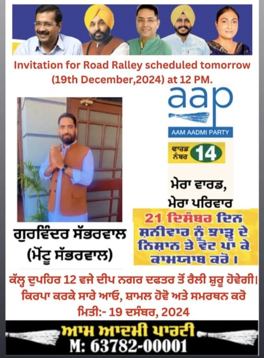 दीपनगर में एक ही नारा मोंटू भाई हमारा (जालंधर कैंट कुमार,कुलदीप) वार्ड नंबर 14 से आपकी उम्मीदवार मोंटू सभरवाल के हक में पूरा दीप नगर एक ही नारा लगा रहा है की (एक ही नारा मोंटू भाई हमारा, एक ही नारा मोंटू भाई हमारा) दोपहर 12:00 बजे आप कार्यालय से मोटू सभरवाल के हक में विशाल रैली निकालने जा रही है जिसमें भारी संख्या में वार्ड नंबर 14 के निवासी विकसित हो रहे हैं और पूरे जोर शोर के साथ वार्ड क्षेत्र 14 में प्रचार करेंगे वार्ड नंबर 14 से मुकाबला एक तरफा होता जा रहा है जिसमें बाकी सभी उम्मीदवार बैक फुट पर चले गए हैं क्योंकि उनको भी दिख रहा है कि मोंटू सभरवाल की जीत सुनिश्चित लग रही है।